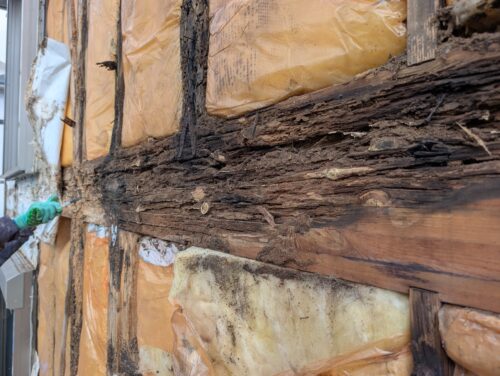 足場を組み上げ、あらためて確認したところ、長年の雨水侵入により建物の下地材まで傷みが進行していることが判明、構造的にも看過できない状態でした。